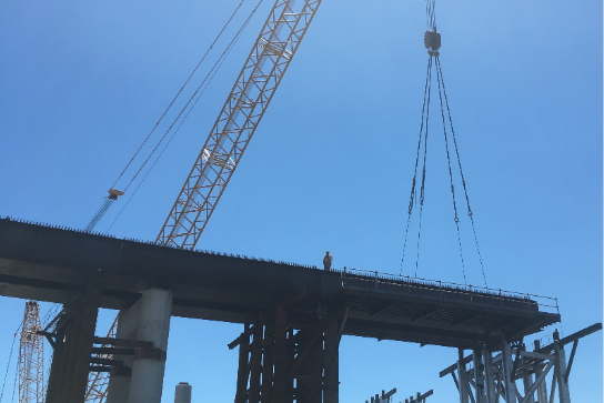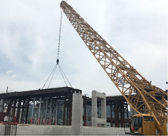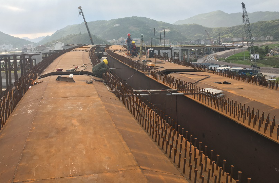 樂清南塘鋼橋本工程LY匝道、LZ匝道、D匝道、MY匝道部分為鋼結(jié)構(gòu),鋼結(jié)構(gòu)采用的形式是疊合梁結(jié)構(gòu),MY匝道結(jié)合梁橋橋?qū)?2.3m,橋跨布置為40+50m,在甬臺(tái)溫高速中央分隔帶上設(shè)獨(dú)柱墩。主梁中心梁高2.2m,鋼梁高1.8m。全橋處于緩和曲線和圓曲線段上,橋面設(shè)置4.847~5%的橫坡,鋼箱梁按等高制作,頂、底板傾斜形成5%的橫坡,超高段的橫坡差值通過橋面板梗肋的高度來調(diào)整,MY匝道結(jié)合梁斷面結(jié)構(gòu)圖如下:單個(gè)開口鋼箱梁底寬為3.1m,底板厚度44mm、24mm,底板橫向共設(shè)5道縱向板式加勁;單個(gè)開口鋼箱梁設(shè)2道腹板,腹板中心間距3m,腹板厚度為24mm和16mm,腹板內(nèi)設(shè)豎向加勁;鋼箱梁上翼板寬度0.6m,鋼板厚度24mm,翼板頂面設(shè)剪力釘。鋼板內(nèi)設(shè)橫隔板,標(biāo)準(zhǔn)厚度12mm,支點(diǎn)附近加厚至30mm。兩個(gè)開口鋼箱梁通過工字形橫梁連接。